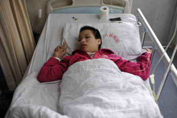 “頭暈,想吐!薄澳z水,很臭!痹趶V州市第十二人民醫院801病房,留著寸頭、遠看像個男孩的檀秋燕雙手反伸著躺在床上,只能一詞一頓地說著簡短的句子。