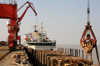 貨船在鹽城大豐港口卸載木材。新華社發 |