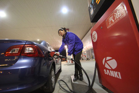3月19日晚,山東省臨沂市郯城縣一家加油站工作人員在為車輛加油! 發改委19日宣布,3月20日零時起,國內汽、柴油零售價格均上調600元/噸,相當于90號汽油和0號柴油每升提高0.44元和0.51元。此次油價調整后,93#汽油將步入“8元”時代。 發改委表示,將于4月底前把2011年對種糧農民、漁業、林業、城市公交、農村道路客運、出租車等部分困難群體和公益性行業的油價補貼清算資金撥付地方,并提前預撥部分2012年補貼資金。
