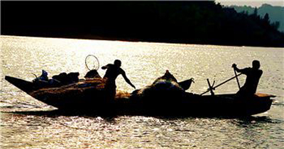 結束了半年之久的禁捕期,漁民們劃著小舟入庫張網捕魚。