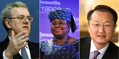 三位候選人分別是:韓裔美籍醫學專家、美國達特茅斯學院校長金辰勇,前世行常務副行長、尼日利亞財政部長奧孔喬·伊韋拉,前聯合國副秘書長、哥倫比亞前財政部長奧坎波。