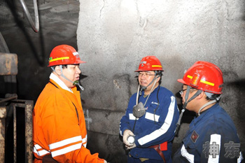 在神東煤炭集團公司“找差距、抓整改、促提升”活動中,董事長張子飛(左)深入礦井檢查安全生產。 |
