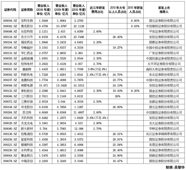 發布公告的148家公司提交的高新技術企業資格復審申請,內容包括2008年至2010年研發費用總額占營業收入總額情況,2010年研發人員占比、大專以上學歷占比情況等數據。然而,《經濟參考報》記者統計上述公司2010年年報發現,在這148家通過高新技術企業資格復審的創業板企業中,“魚目混珠”者不在少數,加上1家首次獲得國家火炬計劃重點高新技術企業的公司,研發費用總額占營業收入總額不達標的有13家,大專以上員工占比不足30%的有14家,研發人員占比不足10%的有3家。