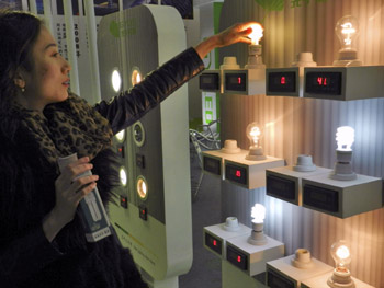 觀眾在2012中國(北京)國際照明展覽會上體驗節能燈與普通燈的區別。新華社發 |
