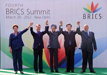 3月29日,金磚國家領導人第四次會晤在印度新德里舉行。這是胡錦濤主席同巴西總統羅塞夫、俄羅斯總統梅德韋杰夫、印度總理辛格、南非總統祖馬合影。記者