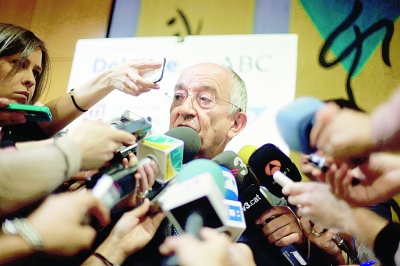 據外媒報道,西班牙央行行長奧德內茲(Miguel Angel Fernandez Ordonez)周二(4月10日)在馬德里的一場會議上說:“如果西班牙經濟比預期更為惡化,繼續給銀行增加資本金將是必要的”。他表示,西班牙經濟不可能在短期內強勁反彈。相關報道稱,西班牙經濟今年正在走入衰退,政府預計經濟將萎縮1.7%。 圖為奧德內茲在接受媒體采訪。