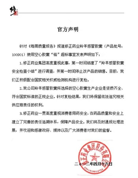 1.修正藥業集團高度重視此事,第一時間組建了“羚羊感冒膠囊安全檢查小組”進行調查,并第一時間停止該產品的銷售。目前,我們正積極配合國家相關權威檢測機構進行復檢。 2.我公司羚羊感冒膠囊所選擇的空心膠囊生產企業是資質齊全、符合國家標準的正規企業。針對復檢結果,我們將保留依法追究相關供應商責任的權利。 3.修正藥業一貫高度重視消費者用藥安全,在藥品質量和安全上建立了完善的責任追溯體系,保障產品安全。我們將及時通報處理進展,并歡迎和感謝政府、媒體以及廣大消費者對我們的監督。 以下為修正藥業官方聲明截圖