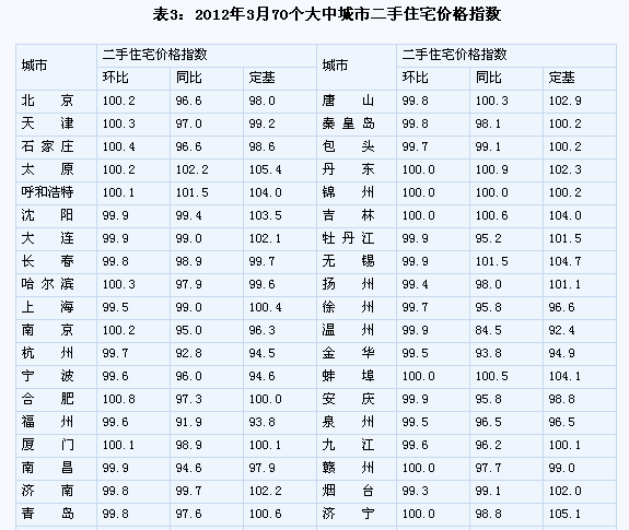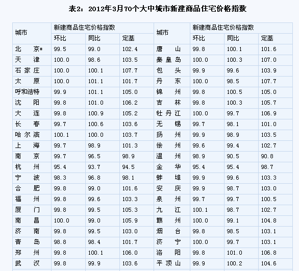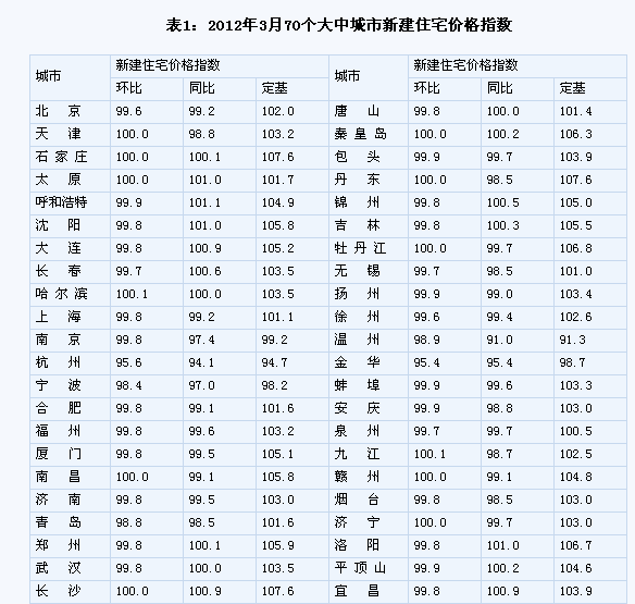 (一)與上月相比,70個大中城市中,價格下降的城市有42個,持平的城市有12個,上漲的城市有16個。環比價格上漲的城市中,漲幅均未超過0.8%。 (二)與去年同月相比,70個大中城市中,價格下降的城市有49個,比2月份增加了5個;持平的城市有1個,上漲的城市有20個。3月份,同比漲幅比2月份回落的城市有15個,漲幅均未超過3.3%。