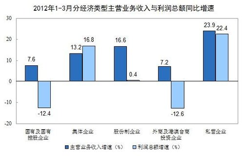 1-3月份,在規模以上工業企業中,國有及國有控股企業實現利潤3172億元,同比下降12.4%;集體企業實現利潤178億元,同比增長16.8%;股份制企業實現利潤5959億元,同比增長0.4%;外商及港澳臺商投資企業實現利潤2515億元,同比下降12.6%;私營企業實現利潤3264億元,同比增長22.4%。