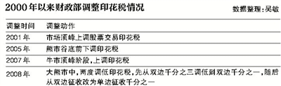 新世紀以來,財政部在2001年市場頂峰上調股票交易印花稅;又在2005年熊市谷底前下調印花稅,再次上調則到了2007年牛市頂峰階段;隨后在2008年大熊市中兩度調低印花稅,先從雙邊千分之三調低到雙邊千分之一,隨后從雙邊征收改為單邊征收千分之一。