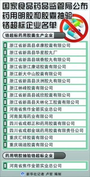 據國家食品藥品監督管理局網站消息,按照企業全覆蓋、品種全覆蓋、產品批次隨機抽樣的原則,國家食品藥品監管局在全國范圍內對藥用明膠和膠囊生產企業進行了全面排查,對18家藥用明膠生產企業抽驗了166批明膠,檢出1批產品鉻超標;對117家藥用膠囊生產企業抽驗了941批藥用膠囊,檢出15家企業74批膠囊鉻超標,不合格率為7.9%。