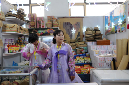 5月14日,兩名身著傳統服飾的婦女在朝鮮首都平壤舉行的第15屆平壤春季國際商品展覽會上。 第15屆平壤春季國際商品展覽會14日在平壤三大革命展示館開幕。來自朝鮮、中國、德國、英國、澳大利亞、意大利等16個國家和地區的270多家公司參展。展覽會將展出2100多種產品,包括機床、電子產品、輕工業產品、食品和醫藥制品、化學制品等。