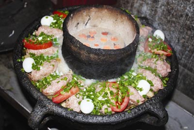現代砂鍋以精選燉得爛熟的豬蹄、土雞定其調,添入金鉤、墨魚調其味,再加筍子、芋頭、木耳、黃花等佐菜填其肚,最后用尖刀圓子鋪蓋其面。湯色金黃,香醇味鮮。