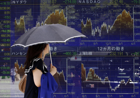 6月4日,在日本東京,一名女士從股指顯示屏前走過。受上周五美股全線重挫打壓,4日亞太地區主要股市普遍大跌。