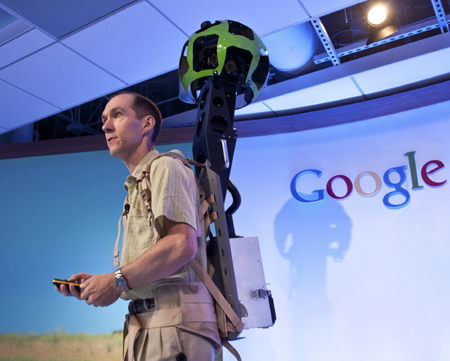 圖為6日在美國舊金山的谷歌公司的辦公室,谷歌地圖總工程師文森特(Luc Vincent)背著Street View Trekker的場景。 谷歌當日宣布,將發布離線導航地圖和航拍3D立體地圖,同時打算提供更為偏遠地區的地面圖景。據外媒報道,蘋果公司毫不回避地表示,要在多維技術上與谷歌進行競爭。另有消息稱,蘋果計劃在今年晚些時候發布一款采用蘋果自有技術的新型地圖應用。