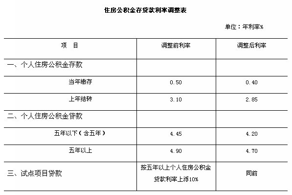 一、從2012年6月8日起,下調個人住房公積金存款利率。當年歸集的個人住房公積金存款利率下調0.10個百分點,由0.50%下調至0.40%;上年結轉的個人住房公積金存款利率下調0.25個百分點,由3.10%下調至2.85%。