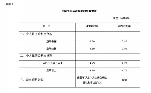 一、從2012年6月8日起,下調個人住房公積金存款利率。當年歸集的個人住房公積金存款利率下調0.10個百分點,由0.50%下調至0.40%;上年結轉的個人住房公積金存款利率下調0.25個百分點,由3.10%下調至2.85%。