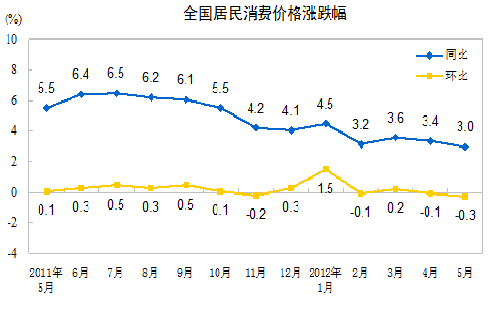 2012年5月份,全國居民消費價格總水平同比上漲3.0%。其中,城市上漲3.0%,農村上漲2.9%;食品價格上漲6.4%,非食品價格上漲1.4%;消費品價格上漲3.6%,服務項目價格上漲1.7%。1-5月平均,全國居民消費價格總水平比去年同期上漲3.5%。