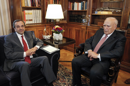 圖為希臘總統帕普利亞斯會見新民主黨領導人薩馬拉斯(左)。