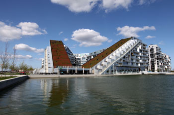 位于丹麥首都哥本哈根的“8字住宅”由丹麥建筑事務所BIG設計,整個大樓平面布局呈“8”字形,人們可騎車沿著露臺花園從街道一直上到10樓的頂層公寓。該建筑采用綠色屋頂,有助于保持室內冬暖夏涼,在減少二氧化碳排放的同時也利于排水。建筑附近配有水景區、居民活動區、超市及小區幼兒園,為居民生活提供了便利,是北歐國家中典型的環境友好型建筑。圖為“8字住宅”外景。新華社發(吳波