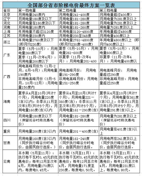 中新網能源頻道了解到,在已公布階梯電價最終實施方案的北京、遼寧、河北、河南、江蘇、上海、浙江、廣東、廣西,海南、云南、四川、重慶、甘肅等14個省市中,對“一戶一表”抄表到戶,用戶執行階梯電價,電價均分三檔。
