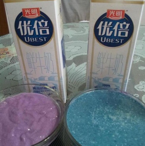 網友Josphin在微博爆料稱,用光明優倍牛奶調出的紫薯呈現出藍色。圖片來源:網友微博