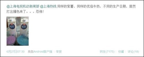 6月27日,網友Josphin在微博爆料稱,用光明優倍牛奶調出的紫薯呈現出藍色,懷疑牛奶存在質量問題,“同樣的紫薯,同樣的優倍牛奶,不同的生產日期,居然打出撞色來了”。