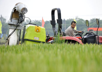 春暉農機合作社的一位農戶用“加農炮”式噴霧器進行農作。記者