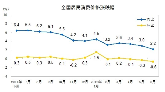 2012年6月份,全國居民消費價格總水平同比上漲2.2%。其中,城市上漲2.2%,農村上漲2.0%;食品價格上漲3.8%,非食品價格上漲1.4%;消費品價格上漲2.3%,服務項目價格上漲1.9%。上半年,全國居民消費價格總水平比去年同期上漲3.3%。