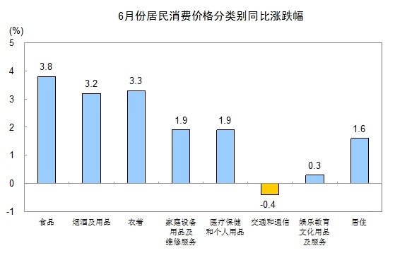 6月份,食品價格同比上漲3.8%,影響居民消費價格總水平同比上漲約1.20個百分點。其中,鮮菜價格上漲12.1%,影響居民消費價格總水平上漲約0.30個百分點;水產品價格上漲8.6%,影響居民消費價格總水平上漲約0.21個百分點;糧食價格上漲3.2%,影響居民消費價格總水平上漲約0.09個百分點;油脂價格上漲6.0%,影響居民消費價格總水平上漲約0.07個百分點;鮮果價格上漲0.6%,影響居民消費價格總水平上漲約0.01個百分點;肉禽及其制品價格下降1.7%,影響居民消費價格總水平下降約0.13個百分點(豬肉價格下降12.2%,影響居民消費價格總水平下降約0.43個百分點);蛋價格下降3.6%,影響居民消費價格總水平下降約0.03個百分點。
