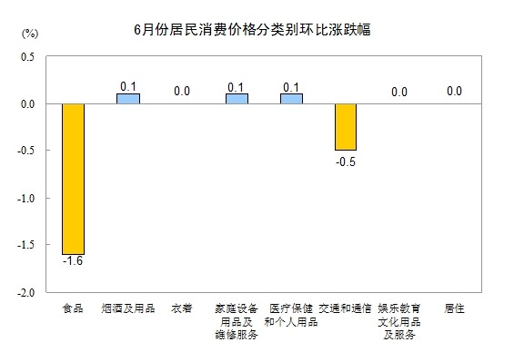 6月份,全國居民消費價格總水平環比下降0.6%。其中,城市下降0.6%,農村下降0.5%;食品價格下降1.6%,非食品價格持平(漲跌幅度為0);消費品價格下降0.9%,服務項目價格上漲0.3%。