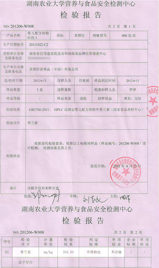經檢測,標注“美贊臣營養品(中國)有限公司”生產的生產日期為“20111022B2”、批號為“0028887CH1KNW5B”盒裝嬰兒配方奶粉(1階段)和生產日期為“20120418”、批號為“0057427CH2DJN5C”灌裝嬰兒配方奶粉(1階段)兩種型號的產品因含有香蘭素被判不合格。雅培、惠氏等洋品牌的1階段嬰兒配方奶粉均檢測出香蘭素,被判不合格。根據《食品安全國家標準食品添加劑使用規定》GB2760—2011要求,凡使用范圍涵蓋0至6個月嬰幼兒配方食品不得添加任何食用香料。