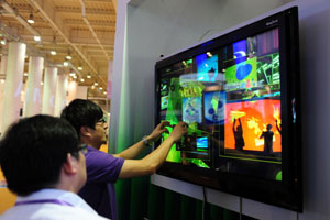 6月15日,在第十屆中國國際軟件和信息服務交易會上,參展商向觀眾演示紅外多點觸摸屏。 此屆軟交會主題為“創新驅動增長,融合深化應用——騰‘云’駕‘物’,智能互聯”。展會聚焦新一代信息技術帶來的重大變革和機遇,解讀新形勢下的國際合作機遇和產業發展空間,展示技術創新帶來的全新智能應用,展望智慧引領的數字新未來。記者 潘昱龍/攝 |