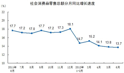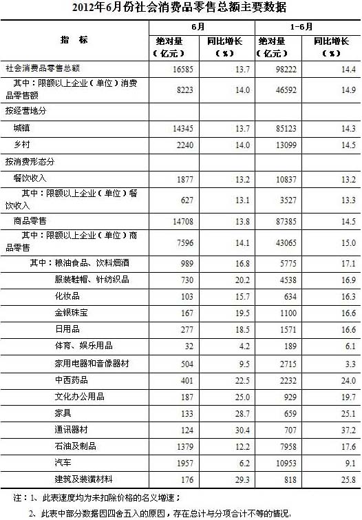 2012年6月份,全國社會消費品零售總額16585億元,同比名義增長13.7%(扣除價格因素實際增長12.1%,以下除特殊說明外均為名義增長)。其中,限額以上企業(單位)消費品零售額8223億元,增長14%。1-6月份,社會消費品零售總額98222億元,同比名義增長14.4%(扣除價格因素實際增長11.2%)。從環比看,6月份社會消費品零售總額增長1.08%。