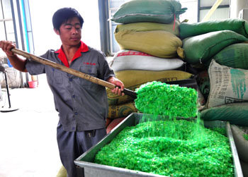 山東濱州市鄒平縣九戶鎮的再生資源生產廠,用自主研發的生產機械,把回收來的廢舊塑料經粉碎、清洗、挑揀、瀝干、加溫、拉伸、打卷等流程,生產出60余種打包帶,生產工藝環保無污染。該廠每年消耗處理廢舊塑料萬余噸。新華社發(董乃德 攝) |