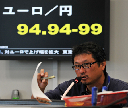 23日亞洲股市早盤中,歐元慘現潰堤之勢。來自中國外匯交易中心的最新數據顯示,7月23日歐元對人民幣匯率中間價報7.6762,較前一交易日下行560個基點,為近10年來首次跌破7.7關口。當日東京外匯市場歐元對日元匯率跌破1:95關口,刷新11年多來低點。歐元近日持續承壓,導致市場焦慮進一步加劇。 圖為7月23日,日本外匯市場的一名交易員在工作。