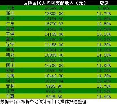據記者統計,包括上海、浙江、北京、廣東、福建、天津在內的六個省市居民人均收入超過了全國平均水平的12509元,其中收入領跑者上海高出全國平均水平8000多元。