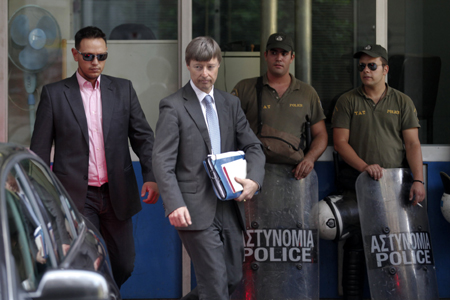 圖為30日歐盟委員會的談判代表馬提亞·莫爾斯(左二)離開希臘財政部。
