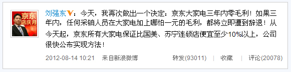 8月14日上午,京東商城CEO劉強東通過微博宣布,京東商城所有大家電將在未來三年內保持零毛利,并“保證比國美、蘇寧連鎖店便宜至少10%以上”。