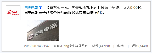 在蘇寧易購發布上述促銷信息后,劉強東在微博上宣布,從15日上午9時開始,京東商城所有大家電價格都比蘇寧線上線下便宜,并且是無底線的便宜,“如果蘇寧敢賣1元,那京東的價格一定是0元!”