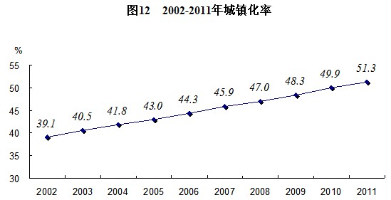 城鎮化是擴大內需的戰略重點,也是社會轉型發展的重要標志。黨的十六大以來,按照統籌規劃、合理布局、完善功能、以大帶小的原則,一批城市發展總體規劃制定實施,城市體系和功能不斷完善,人口和經濟的集聚能力不斷增強。2011年,城鎮總人口比2002年增長了37.6%,鄉村總人口減少了16.1%。2011年,我國城鎮化率首次突破50%,達到51.3%,比2002年提高12.2個百分點,我國城鄉結構發生歷史性變化。城鎮吸納就業的能力不斷增強。2011年,城鎮就業人員35914萬人,比2002年增加10755萬人,年均增加1195萬人。城鎮就業人員占全國就業總量的比重為47.0%,比2002年提高12.7個百分點。城鎮就業崗位的快速增加,帶動了鄉村勞動力不斷向城鎮轉移。
