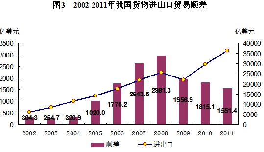 9.5個百分點?傮w上看,近年來我國進出口不平衡狀況逐步改善,2009-2011年,貿易順差比上年分別減少1024億美元、142億美元和264億美元。