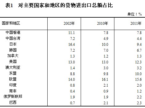 工業制成品出口比重進一步提高,貿易多元化格局逐步形成,內外需不平衡狀況逐步改善。在對外貿易方面,面對復雜多變的國內外形勢,黨中央緊緊抓住加入世界貿易組織的機遇,積極應對國際金融危機帶來的沖擊和挑戰,堅持統籌國內國際兩個大局,不斷加快轉變對外經濟發展方式,努力促進國際收支基本平衡。進出口貿易規模穩步擴大。2011年,貨物進出口總額達到36421億美元,比2002年增長4.9倍,年均增長21.7%。進出口商品結構不斷優化。在出口總額中,工業制成品占比由2002年的91.2%提高到2011年的94.7%;機電產品由48.2%提高到57.2%;高新技術產品由20.8%提高到28.9%。同時通過加大財稅支持、加強金融服務和提高貿易便利化水平等措施,積極擴大進口。先進技術、設備、關鍵零部件進口快速增長,大宗資源能源產品進口規模不斷擴大。2011年,機電產品進口7533億美元,比2002年增長3.8倍;高新技術產品進口4630億美元,增長4.6倍。鐵礦砂及其精礦進口6.9億噸,比2002年增長5.2倍;原油進口2.5億噸,增長2.7倍。從市場結構看,中國與新興經濟體貿易增長強勁。2002-2011年,與印度、俄羅斯、巴西、南非和東盟雙邊貿易占貨物進出口總額的比重由12.7%上升至17.7%,上升了5個百分點。歐盟、美國、日本和香港市場占中國貨物進出口總額的比重則由54.5%下降至45.0%,下降