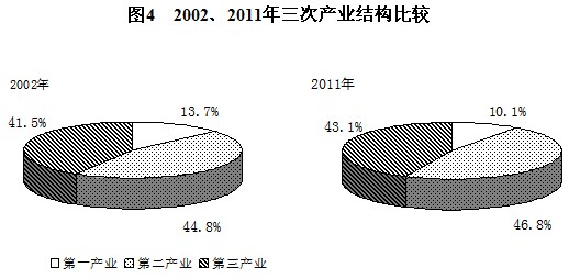 黨的十六大以來,黨中央、國務院按照科學發展觀的要求,圍繞發展現代農業、走新型工業化道路和促進服務業快速發展的目標,大力推進結構調整,三次產業趨向協同發展。2003-2011年,第一產業年均增長4.6%,第二產業年均增長11.9%,第三產業年均增長11.1%,均保持較快發展態勢。經濟增長由主要依靠工業帶動向三次產業協同帶動轉變。從三次產業結構看,第一產業增加值占國內生產總值比重明顯下降,從2002年的13.7%下降到2011年的10.1%,下降了3.6個百分點;第二產業增加值占國內生產總值比重從2002年的44.8%提高到2011年的46.8%,提高了2.0個百分點;第三產業增加值占國內生產總值的比重從2002年的41.5%提高到2011年的43.1%,提高1.6個百分點。