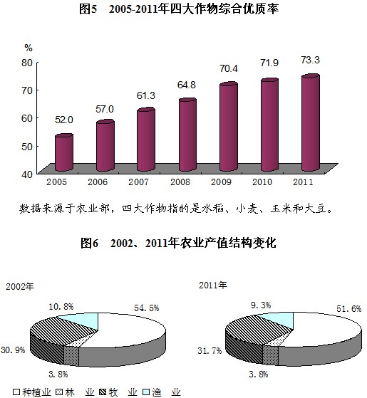 農業生產穩步發展,優質農產品比重明顯上升,農業基礎地位不斷穩固。黨的十六大以來,黨中央、國務院確立了把解決好“三農”問題作為全黨工作重中之重的戰略思想,制定了“工業反哺農業、城市支持農村”和“多予、少取、放活”的指導方針,部署了加快發展現代農業、建設社會主義新農村的戰略任務,取消了農業稅,實行了對農、畜、林及草原等的直接補貼、良種補貼、農機具購置補貼和農資綜合補貼,全面放開糧食購銷,推進集體林權制度改革,堅持不懈地推進農業科技進步,加快推進現代農業建設,農業生產穩步發展,農業基礎地位不斷穩固。糧食生產扭轉了一度下滑局面,實現了“八連增”。2011年,糧食總產量達到57121萬噸,比2002年增長25.0%,年均增長2.5%,連續5年穩定在5億噸以上,其他主要農產品也穩中有增。與此同時,農業結構不斷優化,優質農產品比重明顯上升,規;N養、區域化布局、標準化生產加速推進。2011年水稻、小麥、玉米優質化率分別達到81.0%、74.3%和64.6%,分別比2005年提高16.3、25.5和27.7個百分點。大宗農產品生產繼續向優勢產區集中,13個糧食主產省對糧食增產的貢獻達到90%以上。農業物質技術裝備水平穩步提高,農田有效灌溉面積擴大了7300多萬畝,農作物耕種收綜合機械化率提高了18.6個百分點。2011年農業科技貢獻率達到53.5%,有力支撐了農業持續穩定發展。