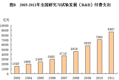 努力提高科技創新對經濟發展的貢獻,逐步擺脫經濟發展對資源消耗和環境投入的過度依賴,是落實科學發展觀的重要內涵。十六大以來,黨中央、國務院十分重視推進科技創新,大力實施科技、教育、人才三項中長期發展規劃綱要?萍纪度氤掷m增加,科技發展成果豐碩。2011年,全國研究與試驗發展(R&D)經費支出8687億元,比2002年增長5.7倍,占國內生產總值的比重由1.07%上升到1.84%。2011年,研究與試驗發展人員全時當量[1]288.3萬人年,比2002年增長1.8倍。技術市場成交額4764億元,比2002年增長4.4倍。重要科學前沿和戰略必爭領域取得了一批重大創新成果。千萬億次超級計算機系統“天河一號”研制成功,百畝超級雜交稻試驗田畝產突破900公斤,載人潛水器“蛟龍”號創下了7062米的下潛紀錄,嫦娥一號、二號探月衛星成功發射,神舟九號載人航天飛行圓滿成功,特別是天宮一號目標飛行器與神舟九號飛船順利載人交會對接,標志著我國載人航天工程第二步戰略目標取得了具有決定性意義的重要進展。
