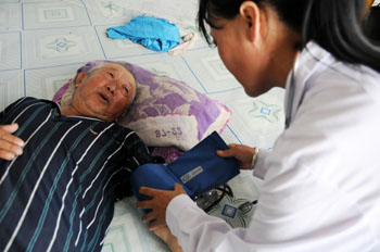黑龍江省鶴崗市蘿北縣2009年被確定為黑龍江省首批基層醫藥衛生體制綜合改革試點縣之一,醫改三年以來,切實減輕了老百姓的“藥擔子”,加上鄉鎮鄉村一體化管理,醫生定期回訪、為村民體檢,暖了鄉鎮老百姓的“心窩子”。 圖為蘿北縣團結鎮紅衛村衛生所醫生李明晶(右)在為一位村民進行血壓測量并詢問近期身體情況。記者