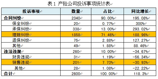 2012年上半年,消費者投訴事項涉及產險公司的共有2600個,同比增長118.3%。其中,合同糾紛類投訴2340個,占90%,同比增長195.08%;違法違規類投訴260個,占10%,同比下降34.67%。