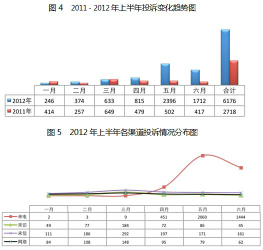 2012年上半年,保監會共接收保險消費者有效投訴件6176件,同比增長127.23%,反映有效投訴事項共6651個,同比增長129.42%。其中:信件投訴1118件,占投訴總量的18.10%,同比下降8.51%;網絡投訴576件,占9.33%,同比下降25.58%;來訪投訴513件,占8.31%,同比下降18.18%;電話投訴3969件,占64.26%,與去年同期相比增加3874件。另外,保監會機關共接收保險消費者提出的信訪復查申請8件。