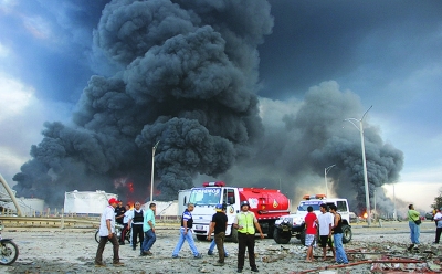 8月25日,在委內瑞拉西部法爾孔州的蓬托菲霍,消防員和救援人員在發生爆炸的阿穆艾煉油廠附近展開工作。